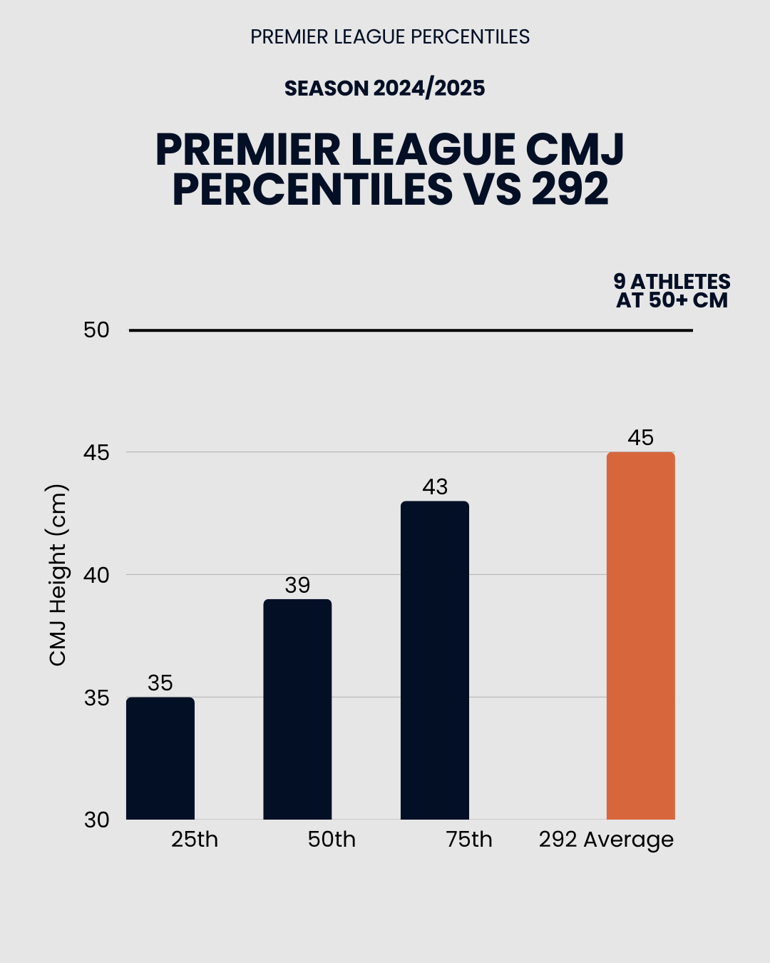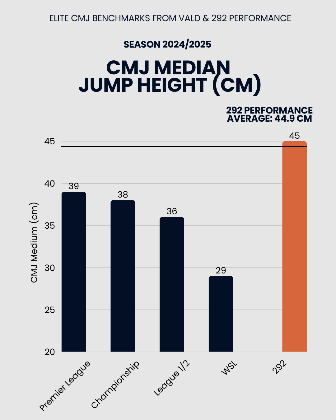 At 292 Performance, the athletes we work alongside have a current average of 44.9 cm, with nine athletes clearing 50 cm. Against league percentiles, that places us above the Premier League 75th percentile at 43 cm.